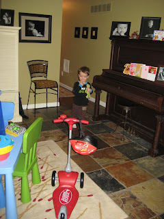 This picture is a little deceptive. John was none to pleased about this! And, they may have tipped over right after the picture was snapped, further aggravating John! He ended up sitting in the stroller in the garage watching Noah play.